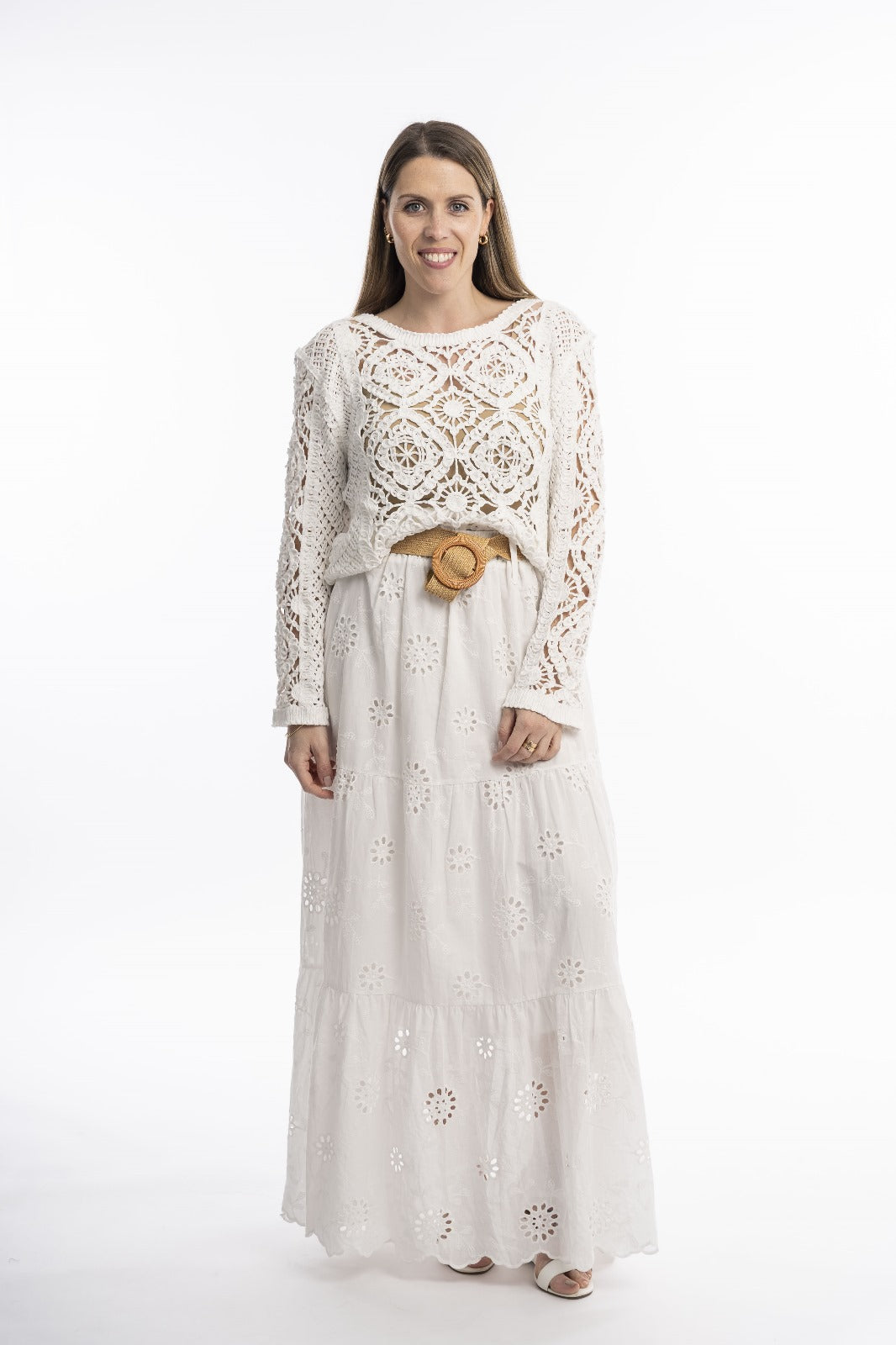 Esta pollera de brodery, fina y elegante, es la elección perfecta para un conjunto veraniego con mucho encanto. Su versatilidad permite combinarla fácilmente con diferentes prendas para lograr un estilo único.